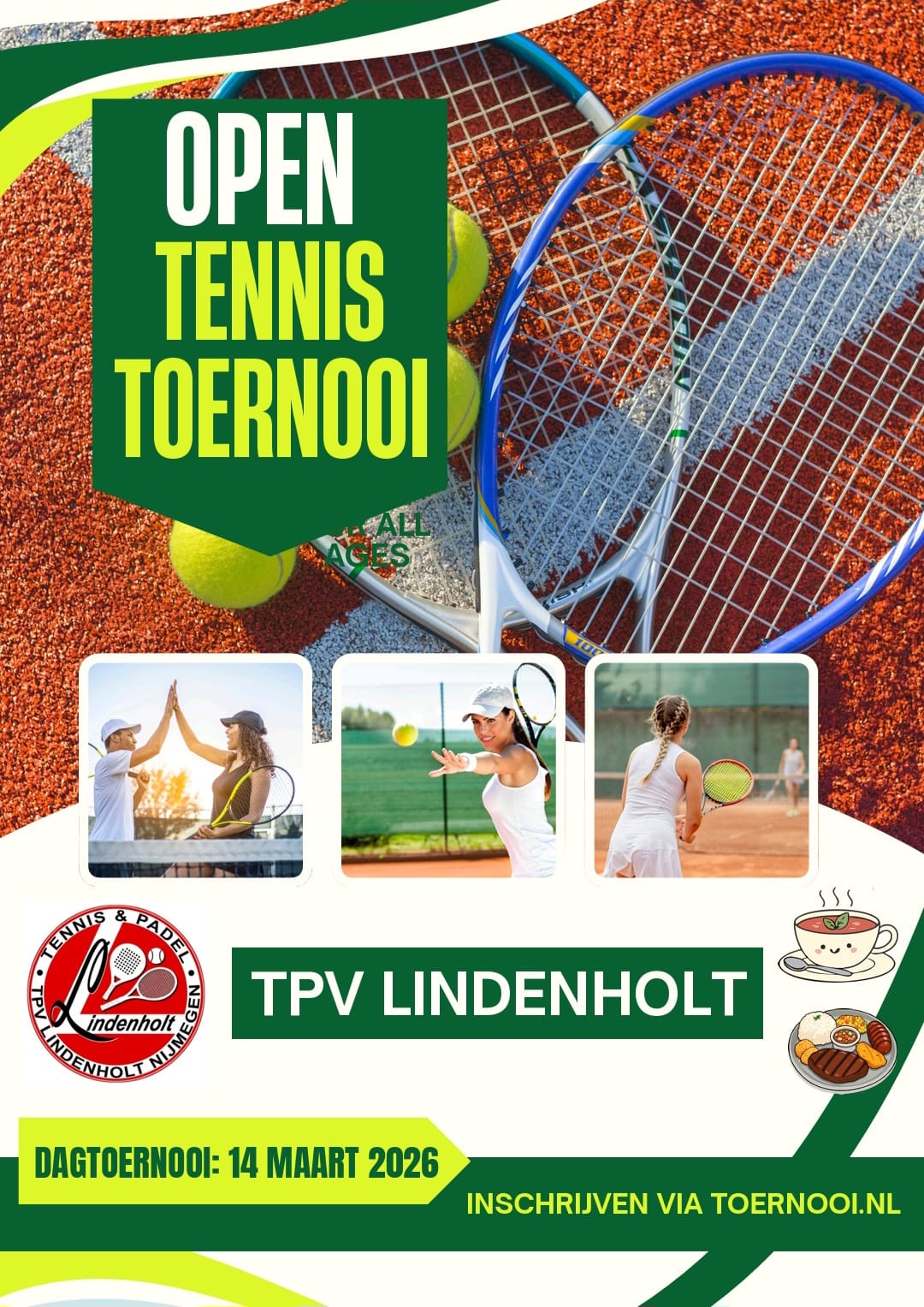 Het dagtoernooi tennis wordt gehouden op 14 maart 2026. Je kunt je nu inschrijven.